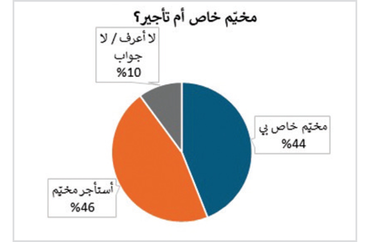 ويبدو أن تملّك مخيّم خاص أو استئجاره أمر قليل التأثير في الرغبة بالتخييم، والدلالة على ذلك أن نسبة 46 بالمئة من المخيّمين يستأجرون أماكن للتخييم (40 بالمئة من الكويتيين – 55 بالمئة من المقيمين العرب) مقابل 44 بالمئة يتوجهون إلى مخيمهم الخاص (52 بالمئة من الكويتيين – 32 بالمئة من المقيمين العرب). وفي التفاصيل، برزت فئة الدخل 3849- 2850 د. ك، كأكثر من يملك مخيماً خاصاً (83 بالمئة منهم) مقارنة بفئات الدخل الأخرى، أكانت أدنى أم أعلى.
