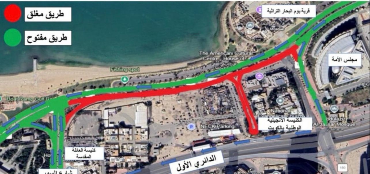 أعلنت وزارة الأشغال العامة بالتعاون مع الإدارة العامة للمرور عن إغلاق كلي مؤقت لشارع الخليج العربي من تقاطع المقصب إلى تقاطع مجلس الأمة وذلك من يوم الخميس القادم من الساعة السادسة مساء إلى يوم الأحد 2026/2/15 الساعة السادسة صباحاً وذلك لفرش الطبقة النهائية من الأسفلت.
