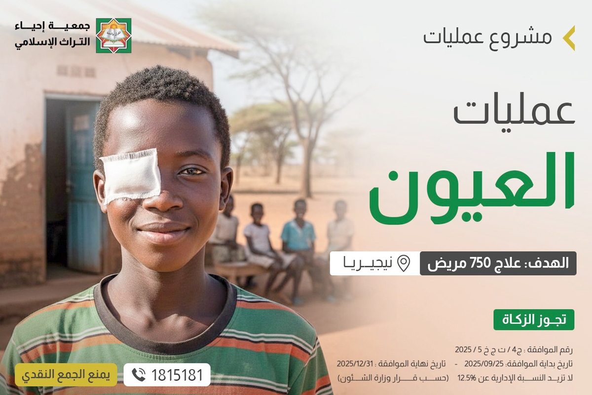 تطلق جمعية إحياء التراث الإسلامي، اليوم، مشروع عمليات العيون، الذي تهدف من خلاله إلى إجراء عمليات العيون لعلاج 750 مريضاً في نيجيريا، وإنقاذ المرضى الفقراء من العمى.