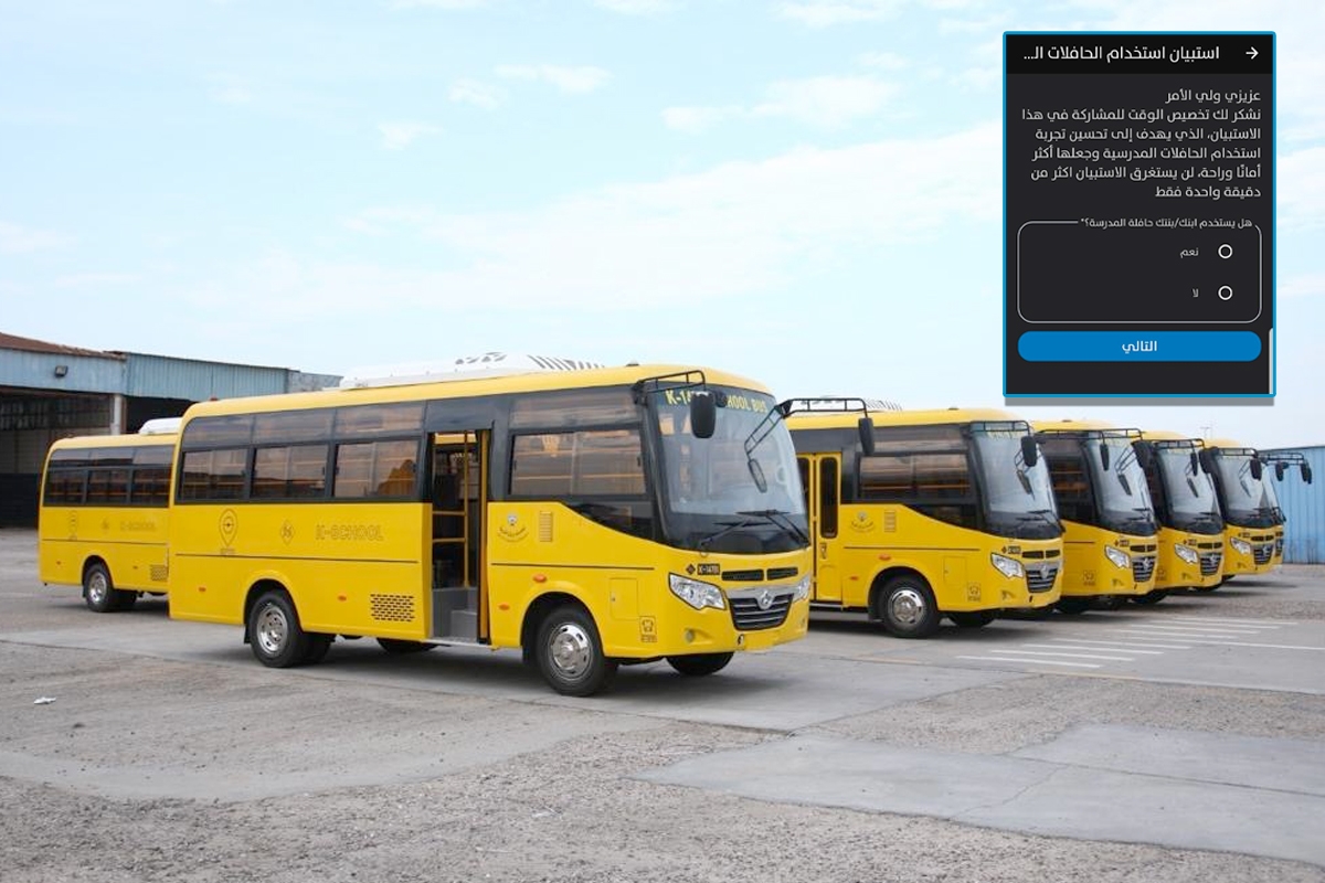 ووجهت التربية استبياناً حول خدمة الحافلات إلى أولياء الأمور عبر تطبيق «سهل» الحكومي، حيث طلبت منهم تحديد رأيهم عن مستوى الخدمة والوقت المستغرق للرحلة ومدى راحة المقاعد وكيفية تطويرها من وجهة نظرهم.