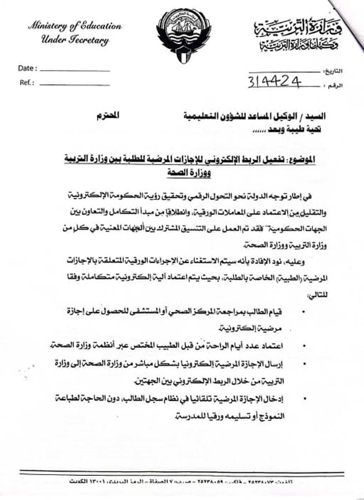 وفي السياق، وجّه الوكيل المساعد لقطاع التعليم بـ «التربية»، م. حمد الحمد، الجهات المعنية في الإدارة العامة للمناطق التعليمية، والإدارة العامة للتعليم الديني، والتربية الخاصة، والإدارة العامة للتعليم الخاص، إلى البدء بتنفيذ إجراءات تطبيق الآلية الإلكترونية الجديدة للإجازات المرضية الخاصة بطلبة المدارس الحكومية والخاصة على حد سواء.