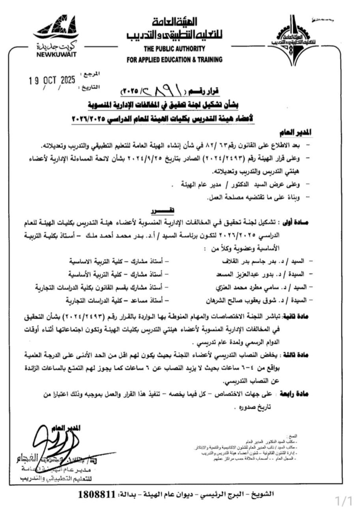 أصدر المدير العام للهيئة العامة للتعليم التطبيقي والتدريب د. حسن الفجام، قرارا يقضي بتشكيل لجنة تحقيق في المخالفات الإدارية المنسوبة إلى عدد من أعضاء هيئة التدريس في كليات الهيئة للعام الدراسي 2025/2026.