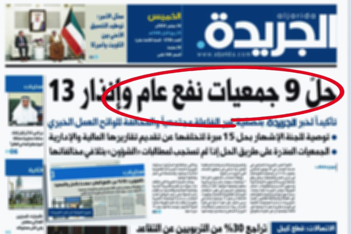 تأكيداً لما نشرته «الجريدة» في عددها الصادر بتاريخ 26 سبتمبر الماضي تحت عنوان «حلّ 9 جمعيات نفع عام وإنذار 13» والتي أشارت خلاله إلى «ثمة 7 جمعيات سيصدر قرار وزاري قريباً بحلّها وتصفية أموالها»، أصدرت وزيرة الشؤون الاجتماعية وشؤون الأسرة والطفولة د. أمثال الحويلة، قرارات حلّ بحق 7 جمعيات أهلية هي: أصدقاء النخلة، حفظ النعمة، كرة السلة، النوير، الكويتية للحرف التقليدية، الصدفية، المتقاعدين.