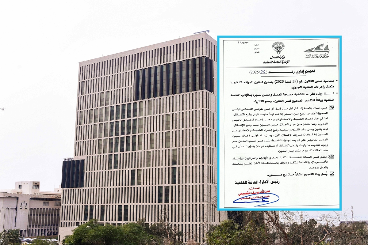 جاء ذلك في تعميم، حصلت «الجريدة» على نسخة منه، ونص على أنه «بمناسبة صدور القانون رقم 59 لسنة 2025، بتعديل قانون المرافعات، فيما يتعلق بإجراءات التنفيذ الجبري، وبناء على ما تقتضيه مصلحة العمل، ووفقاً للتفسير الصحيح لنص القانون، فإنه في حال إقامة إشكال أول من قبل أي من طرفي التداعي، تبقى الحجوزات وأوامر المنع من السفر، إذا تم أي منهما قبل رفع الإشكال».